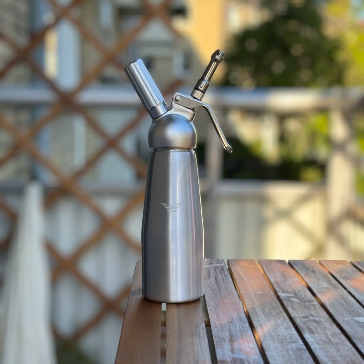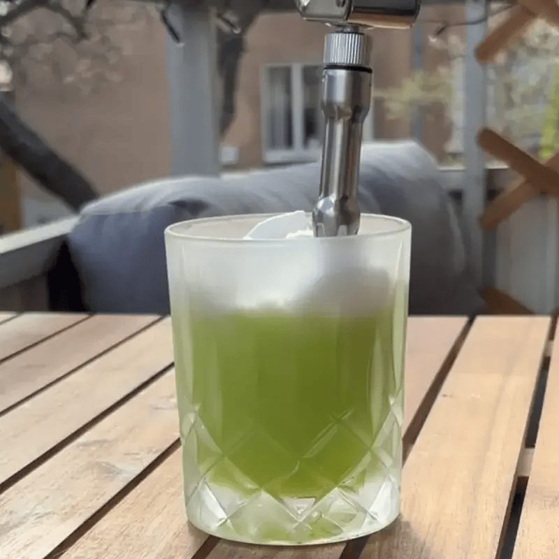 Med denna sifon kan du snabbt göra fint skum med smak – som till exempel kokosskum till en Thai Basil eller ett fläderskum.